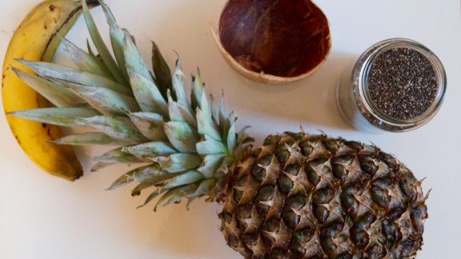 Chia Samen werden bekanntlich als Superfood bezeichnet. Sie enthalten viele Vitamine und Mineralstoffe, wie u.a. Kalzium, Omega 3 Fettsäuren, Magnesium und Ballaststoffe. Eigentlich sollte man jeden Tag mit diesen gesunden Samen starten. Der Geschmack des Powerfoods ist jedoch ziemlich gewöhnungsbedürftig und vielen schmecken die Chia Samen einfach nicht. Der knusprige Chia Pudding schafft da Abhilfe. Die gebackenen Bananen und der Ananas-Bananen Smoothie verleihen dem Frühstück einen exotischen und unwiderstehlichen Geschmack. Und die Mandelsplitter machen aus dem leckeren Gericht einen knusprigen Zmorge.