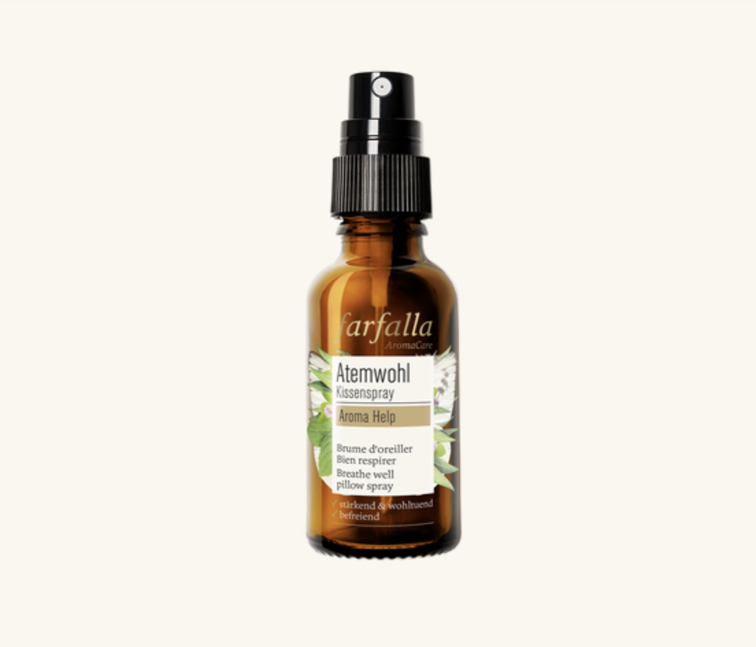 Das Atemwohl Kissenspray aus der Aroma Help-Linie von farfalla ist ein wahrer Game Changer für eine erholsame Nacht. Vor dem Schlafengehen einfach ein paar Spritzer aufs Kopfkissen sprühen und tief einatmen. Eukalyptus befreit die Nase und erleichtert das Durchatmen. 30 ml für CHF 9.90.